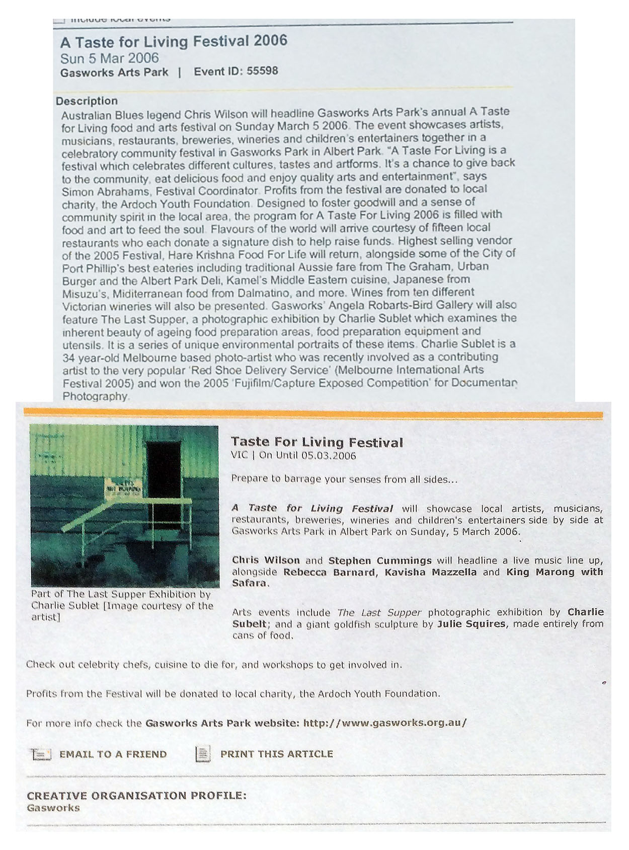 11_CSublet_Pub_0026 ← Previous Next → Coverage re ‘The Last Supper’ exhibition, as part of the ‘A Taste for Living’ festival, a fundraiser for the Ardoch Youth Foundation. Like Loading...