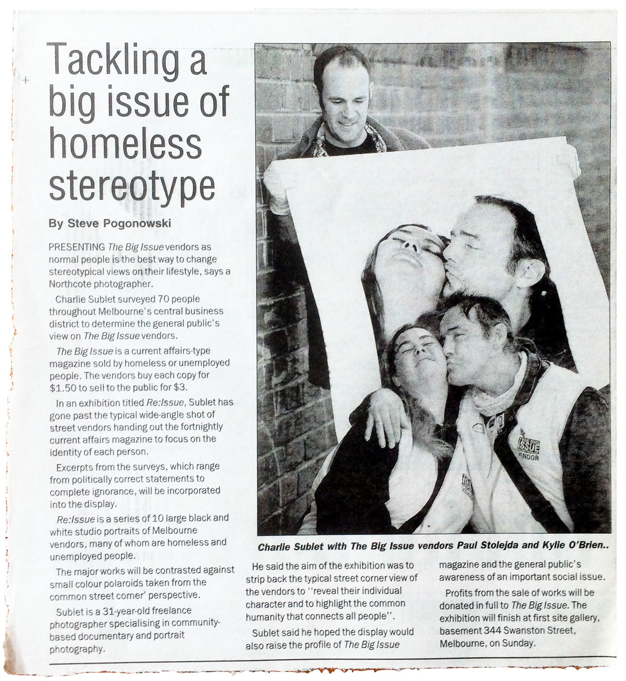 1_CSublet_Pub_0005 ← Previous Next → ‘Northcote Leader’ newspaper, 29.10.03 – coverage of ‘Re:Issue – the Face of Big Issue Vendors’ exhibition. Like Loading...