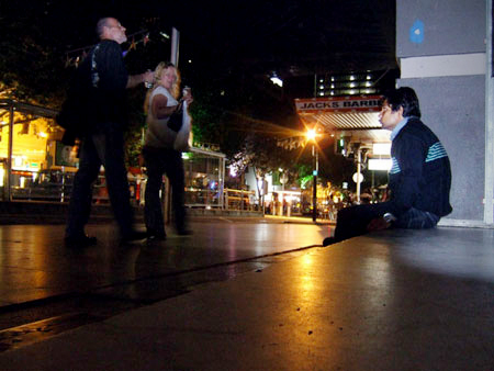 10:31 pm. ‘ One Too Many?’, Bourke St, outside Metro nightclub.