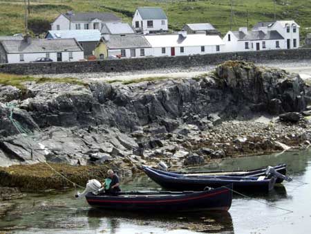 Inishbofin is a strange yet endearing mix of pristine rugged beauty and wildlife, quaint cottages and ugly pre-fab buildings and discarded industrial items. But it works somehow to create an inspiring and intriguing atmosphere. Despite its proximity to the mainland and bustling village of Clifden, it has a sense of isolation and remoteness which refreshes the spirit. And a short enough tourist season (May – September) to keep the locals friendly and sane. Bitter winters and isolation are broken up by cool summers and visitors from foreign lands. A good balance and manageable love affair.