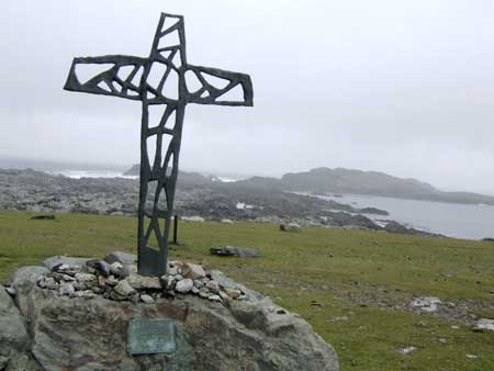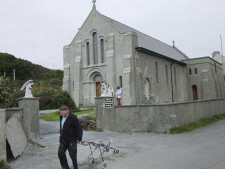 Inishbofin lies 11 kms off the West coast of Ireland in the Connemara region which is famed for its ponies, numerous lakes and mountainous terrain. It’s population of approximately 160 folk is dwarfed by thousands of sheep whose backs are painted in patterns of iridescent red or blue – a method of identifying ownership. Farming and an increasing reliance on tourism provide the main income for the island. While there is an abundance of slate and sheep, virtually all other supplies must be shipped in, including the local priest. He holds mass on a Saturday at the only church, St Colman’s, where the holy water is dispensed from a 20 litre plastic keg in the entrance foyer. Pope John Paul II looks on from a small gilded frame in the background.